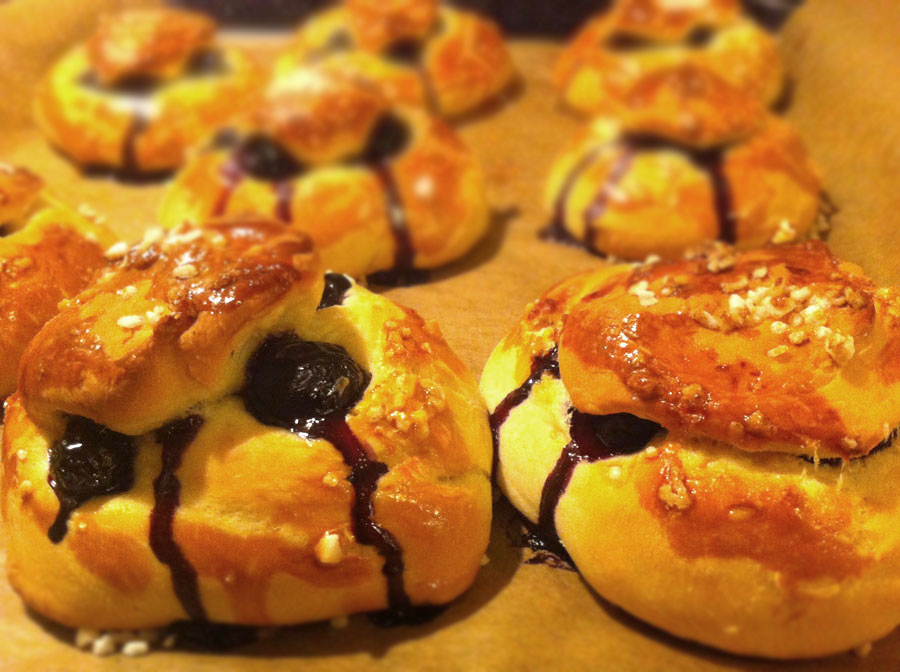 Also gab es erst polnische Piroggen mit Blaubeeren und Vanillesauce und zwei Tage später wunderbare Blaubeer-Brioches. Sehr zu empfehlen.